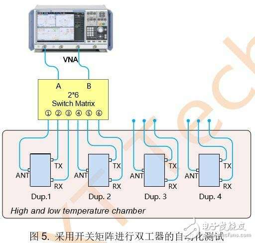 图2显示了采用2&TImes;6开关矩阵进行双工器测试的系统连接图,其中网络分析仪通过开关矩阵后变成了“6端口”。